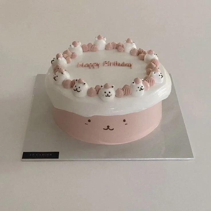 Pink and white minimalist bear cake with small bear icing decorations and Happy Birthday message