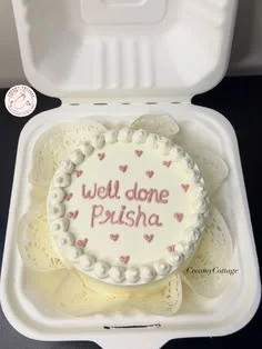 White bento cake with pink piped hearts and a 'Well done Prisha' message in pink icing.