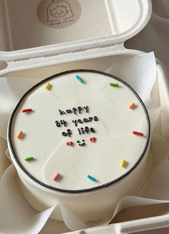 Minimalist white bento cake with rainbow sprinkles and a black icing message reading happy 34 years of life.