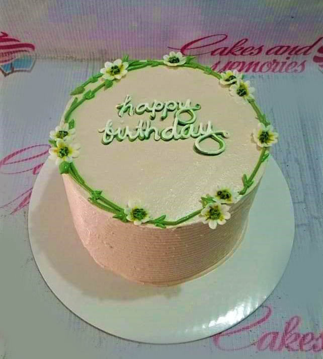 Minimalist light pink birthday cake with a green icing vine border and small white edible flowers.