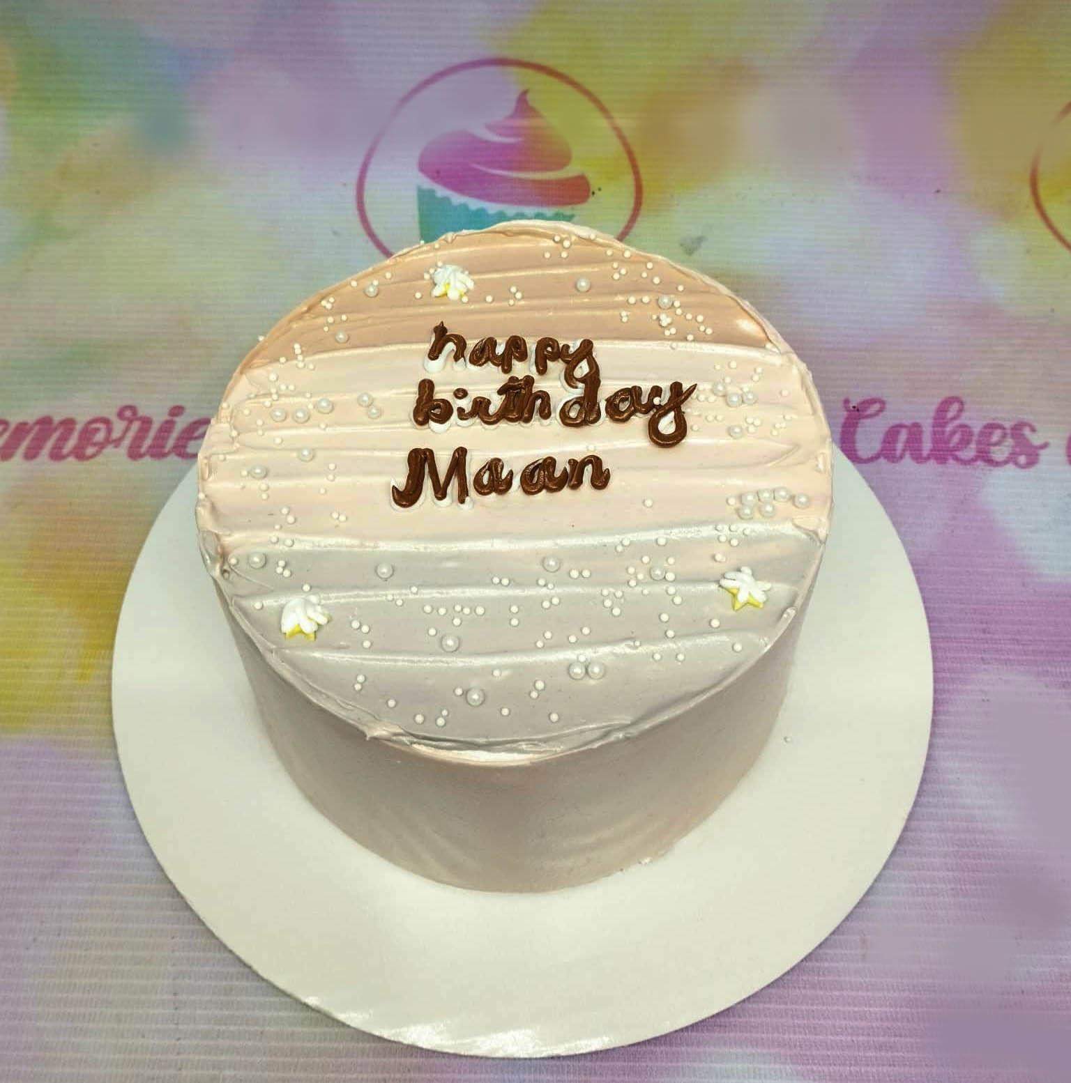 Minimalist single tier birthday cake with horizontal textured icing in a gradient of tan, pink, and lavender with white pearl sprinkles.