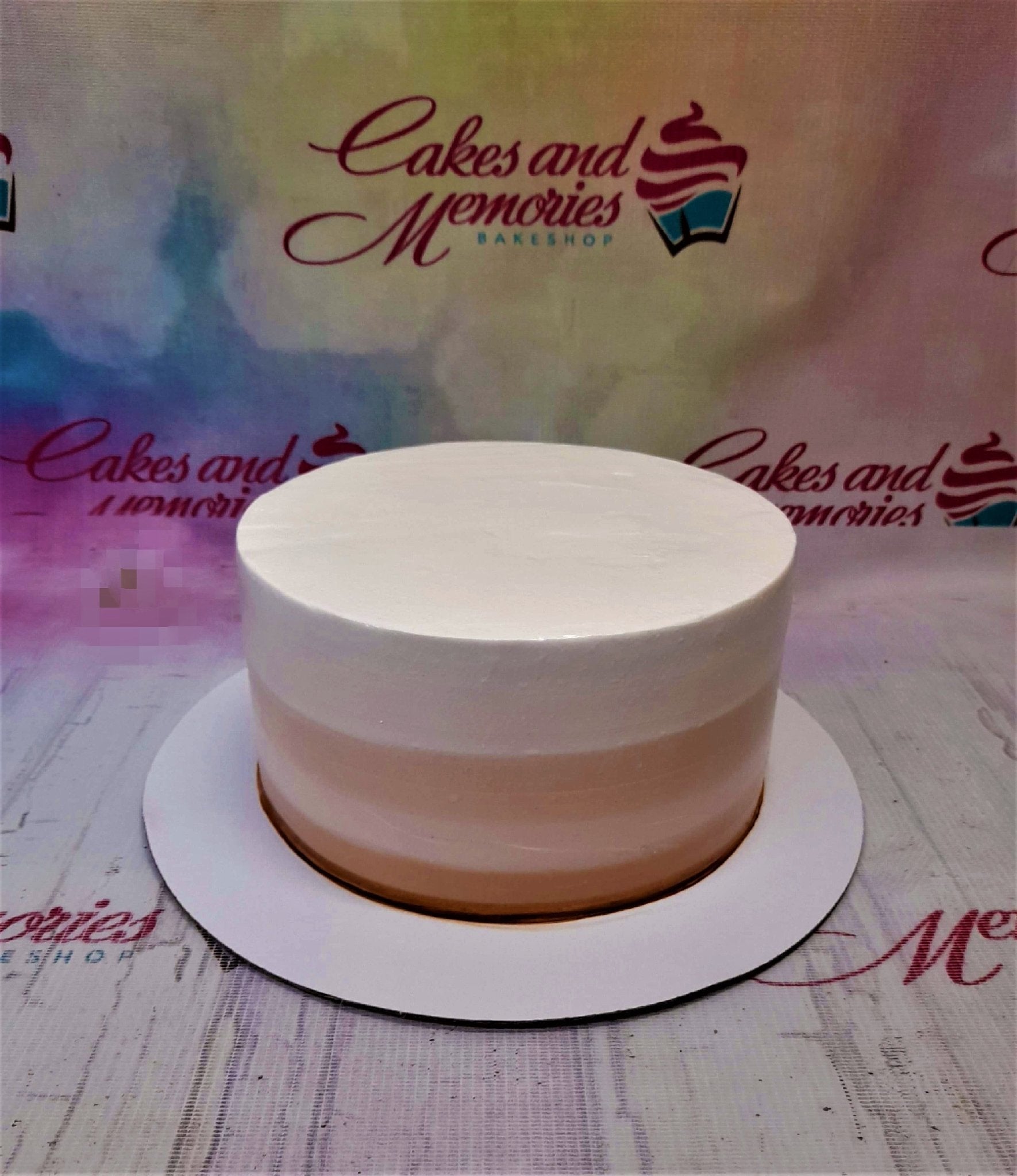 A minimalist single-tier cake with a three-tone ombre icing design in white, light pink, and tan on a white base board.