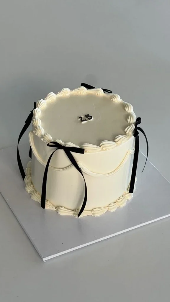Elegant white minimalist cake with black satin ribbons and a small 25 topper on top.