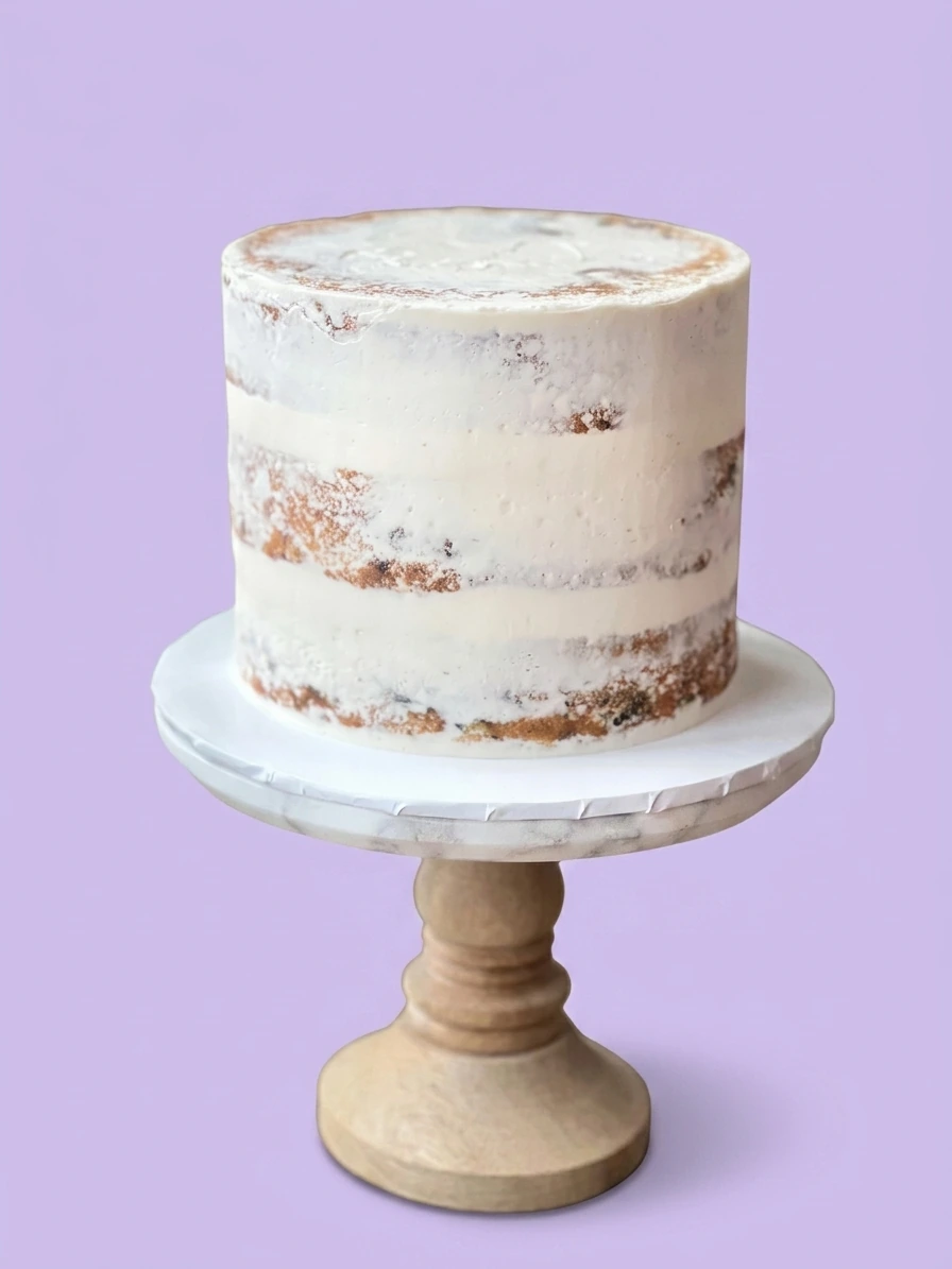 A tall 1-tier semi-naked cake with white soft icing and visible cake layers on a wooden stand.