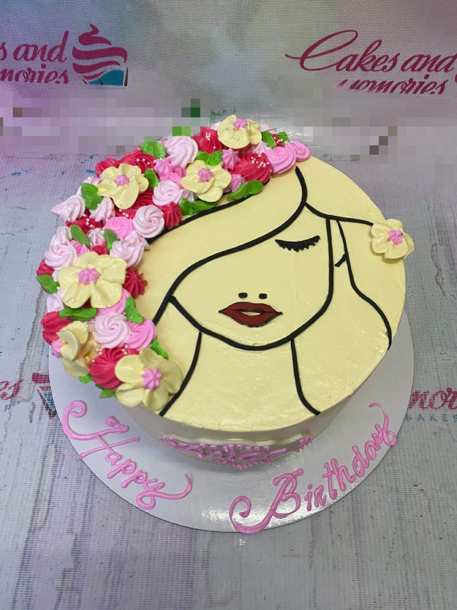 Yellow minimalist cake featuring a piped icing illustration of a woman's face with a floral crown of pink and red rosettes.