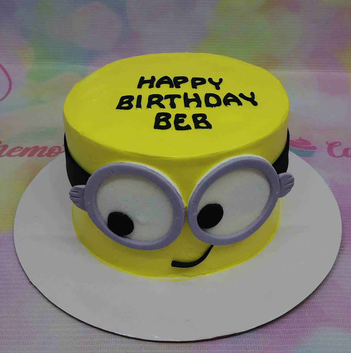 Yellow Minion-themed birthday cake with large fondant eyes, a black strap, and a smiling mouth, featuring a birthday message on top.