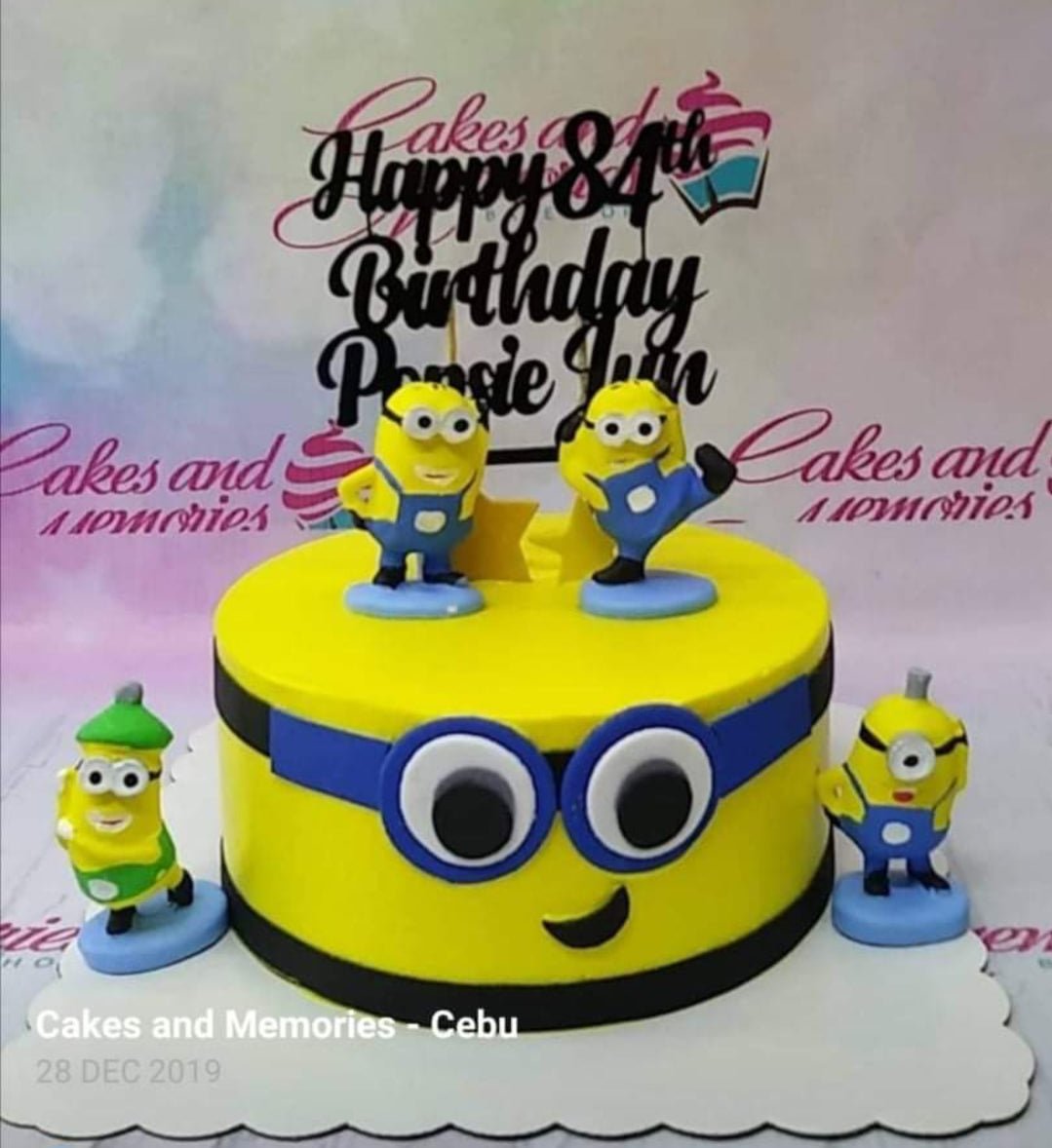 Yellow Minion themed birthday cake with 3D Minion figures and a black Happy 84th Birthday topper.