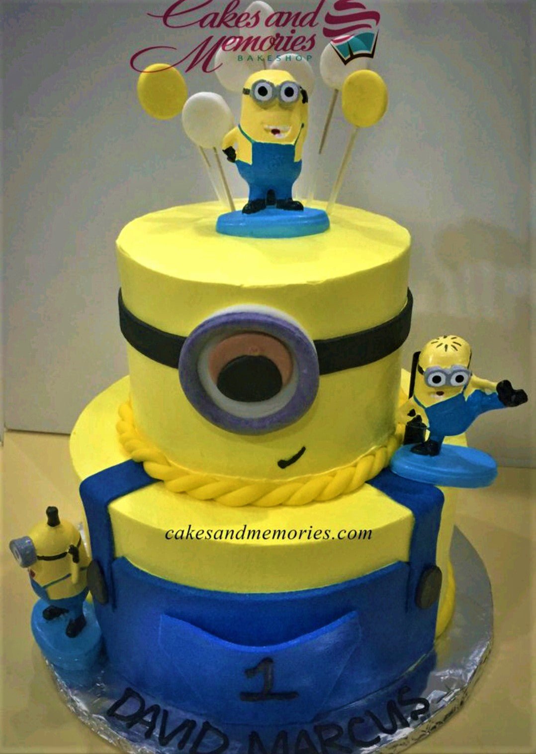 Two-tier yellow and blue Minion themed birthday cake with fondant figures and a large goggle eye design.