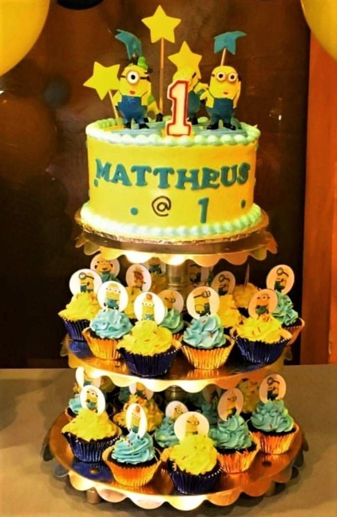 Yellow Minions themed birthday cake with blue icing borders and Minion character toppers on a cupcake stand.