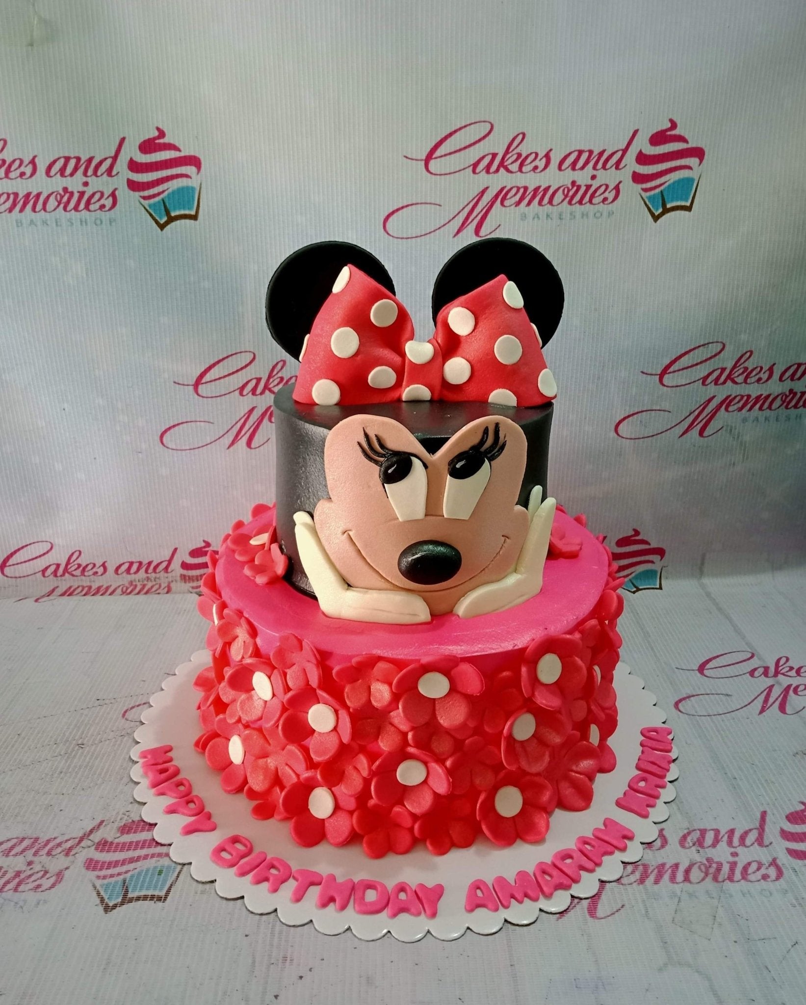 Two-tier Minnie Mouse themed cake with a black top tier featuring Minnie's face and a pink bottom tier covered in red fondant flowers.