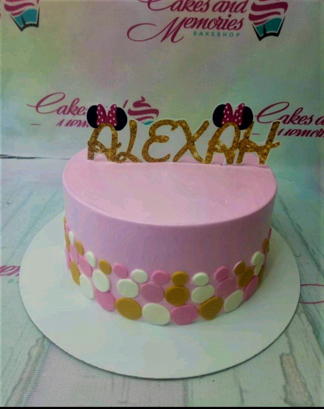 Pink Minnie Mouse themed birthday cake with gold glitter name topper and colorful fondant circles.