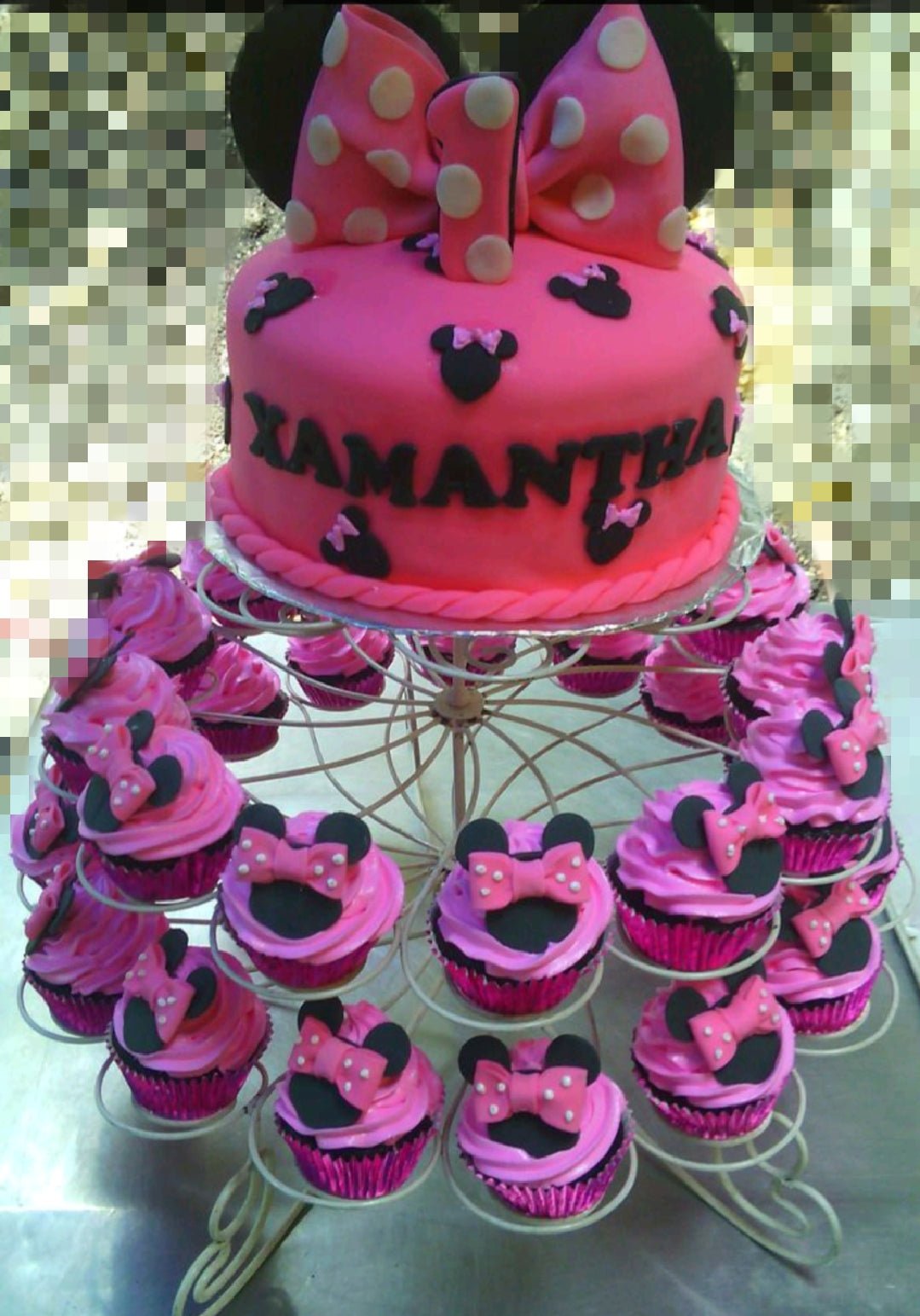 Pink Minnie Mouse themed fondant cake with a large pink polka dot bow and black mouse silhouettes, displayed on a white cupcake stand.