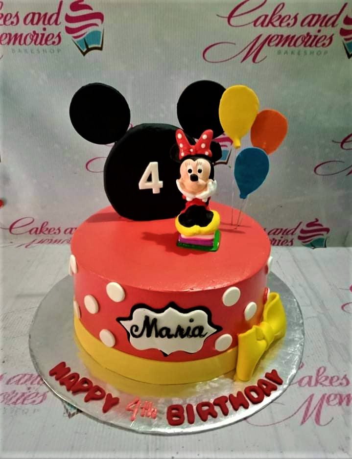 Red Minnie Mouse themed birthday cake with white polka dots, a yellow bow, and a 3D Minnie Mouse figure on top.