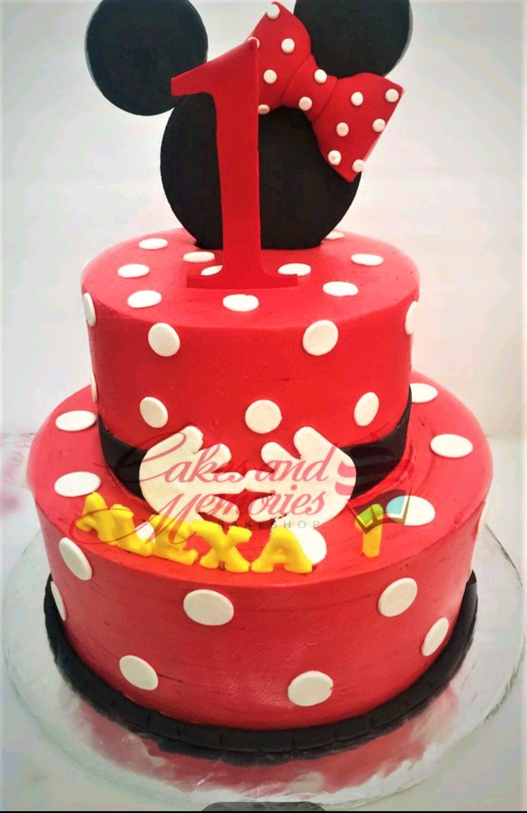 Red and white polka dot Minnie Mouse themed 2-tier birthday cake with black ears and a red bow topper.