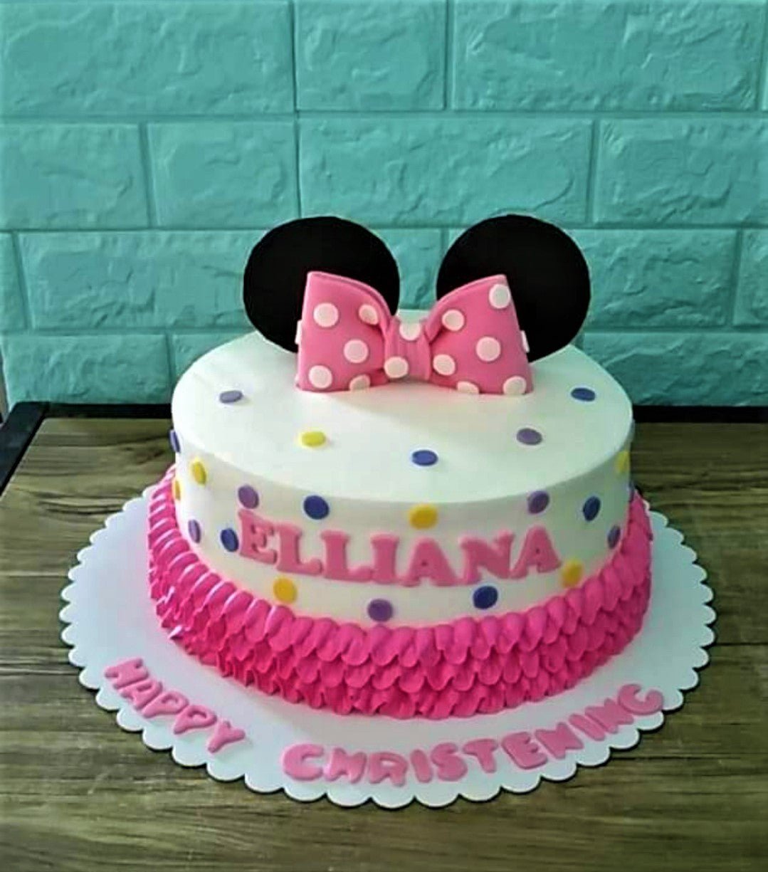 Minnie Mouse themed white cake with pink ruffles, colorful polka dots, and a large pink bow with black ears topper.