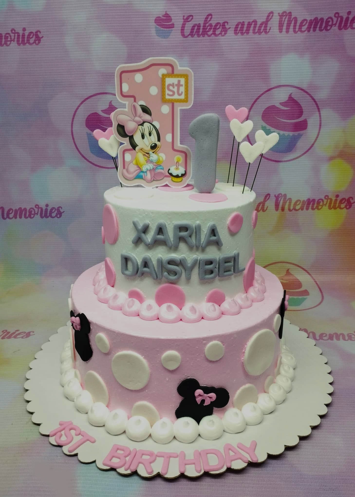 Two-tier Minnie Mouse themed birthday cake in pink and white with polka dots and character toppers.