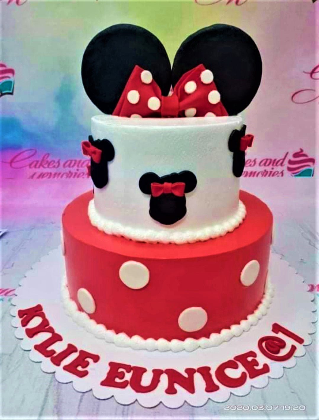 Two-tier Minnie Mouse themed cake with a red bottom tier featuring white polka dots and a white top tier with black Minnie silhouettes.