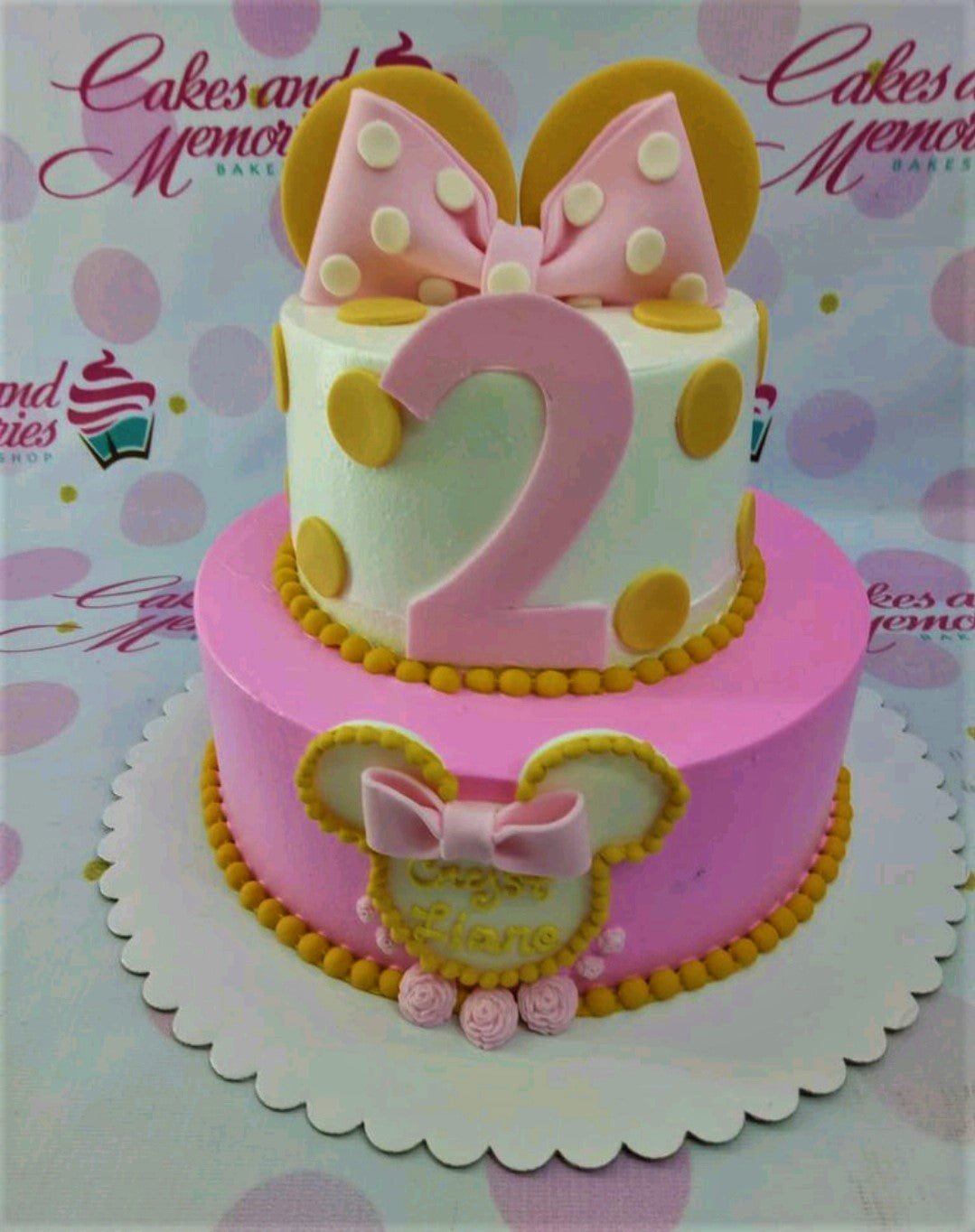 Two-tier pink and white Minnie Mouse themed birthday cake with a large pink number two and yellow polka dots.