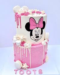 Two-tier Minnie Mouse themed cake with pink and white icing, pink drips, and marshmallow decorations.
