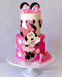 Two-tier Minnie Mouse themed cake with pink and white fondant, featuring a large Minnie Mouse cutout and pink bows.