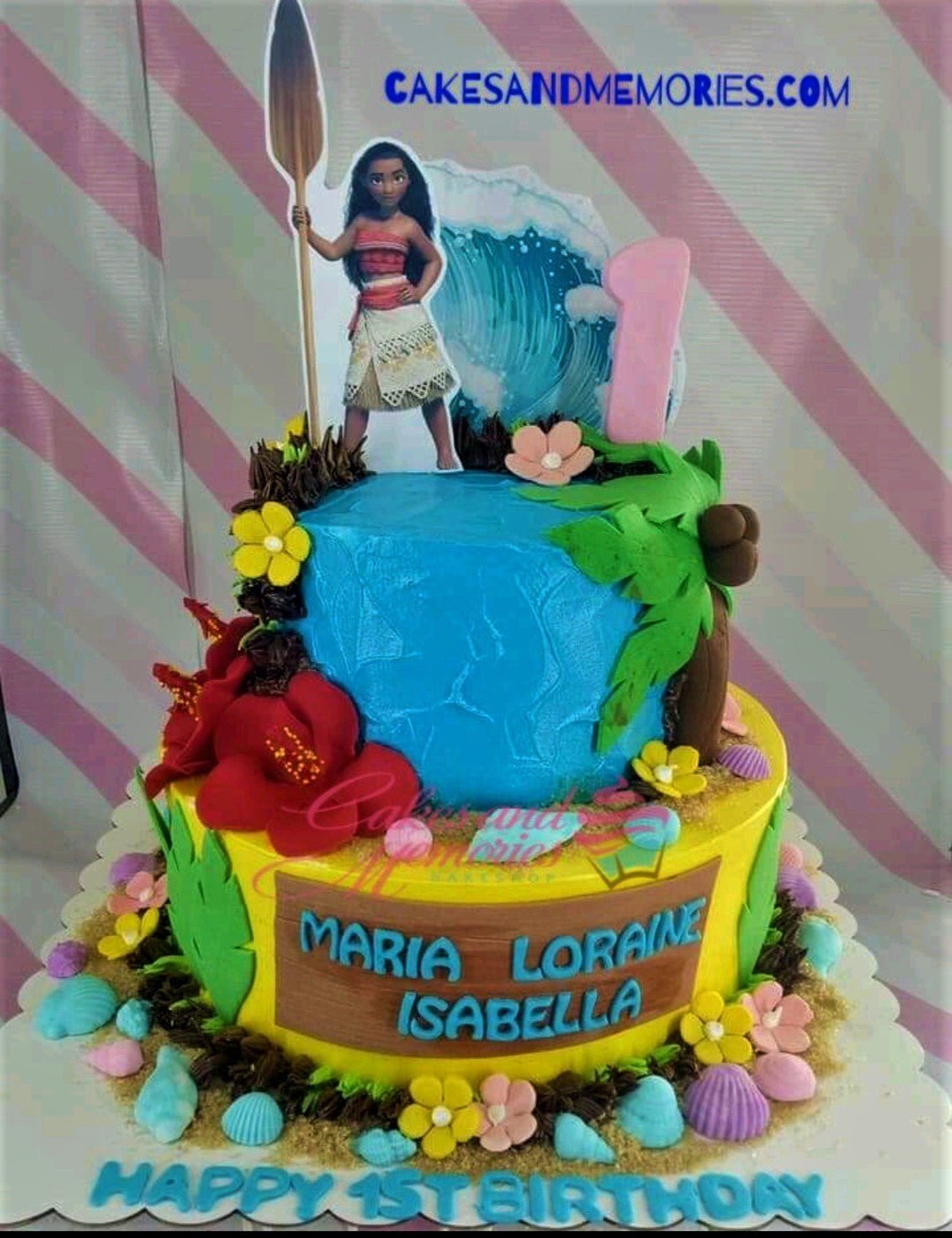 Two-tier Moana themed birthday cake with blue and yellow icing, tropical flowers, palm tree, and Moana character printout.