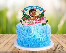 Moana themed birthday cake with blue icing rosettes and a large character printout topper for Isabella Marie.