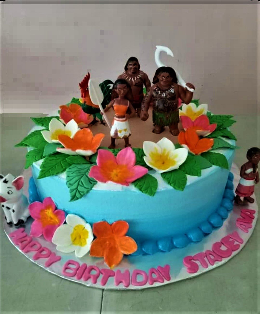 Moana themed birthday cake with blue gradient icing, tropical fondant flowers, and character figurines of Moana, Maui, and Heihei.