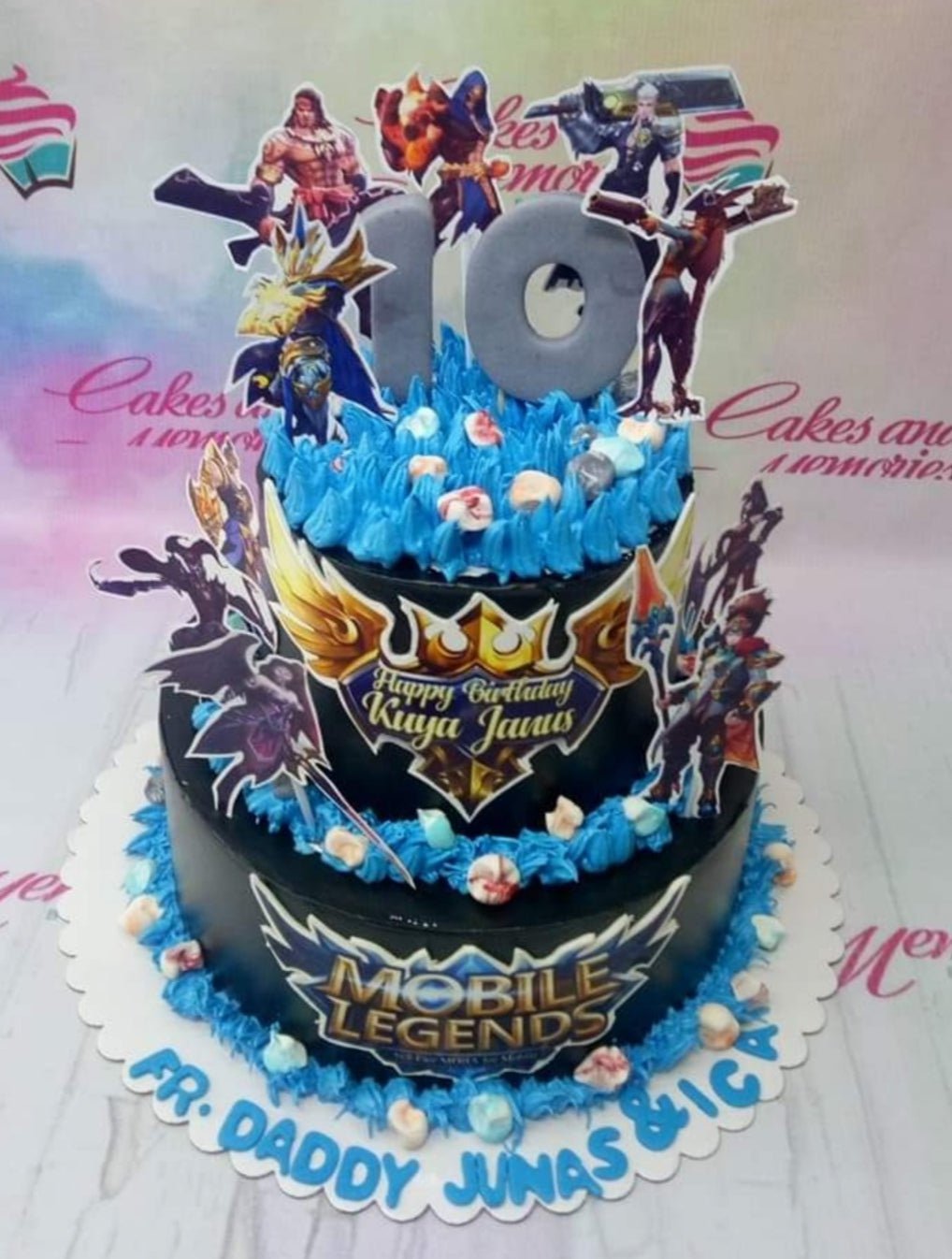 Two-tier Mobile Legends themed birthday cake with black icing, blue rosettes, and character printouts for Kuya Janus.