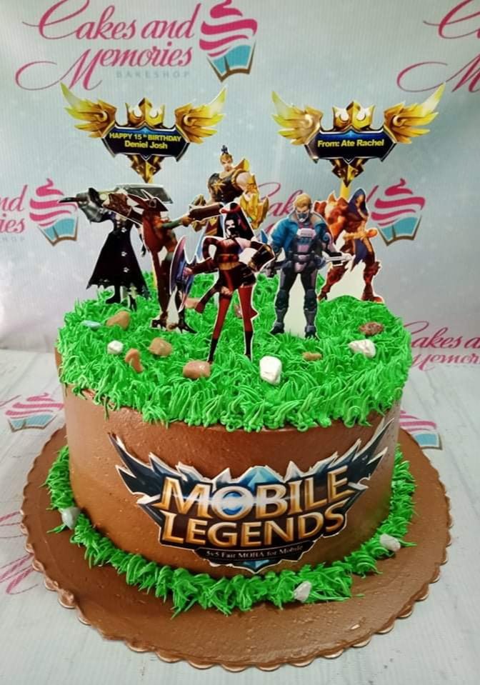 Mobile Legends themed birthday cake with brown icing, green grass piping, and character printouts for Daniel Josh's 15th birthday.