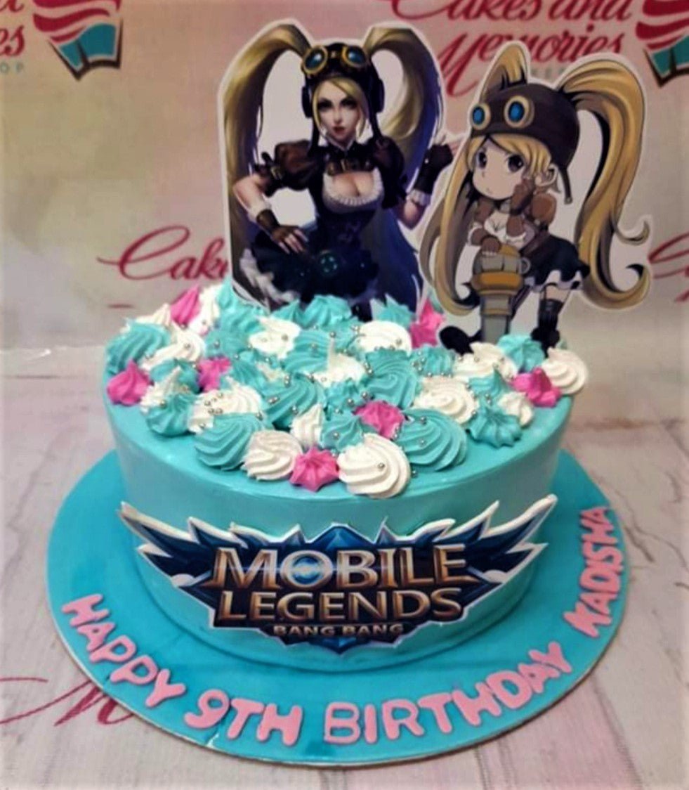 Light blue Mobile Legends themed cake with Layla character printouts and pink, white, and teal icing rosettes.