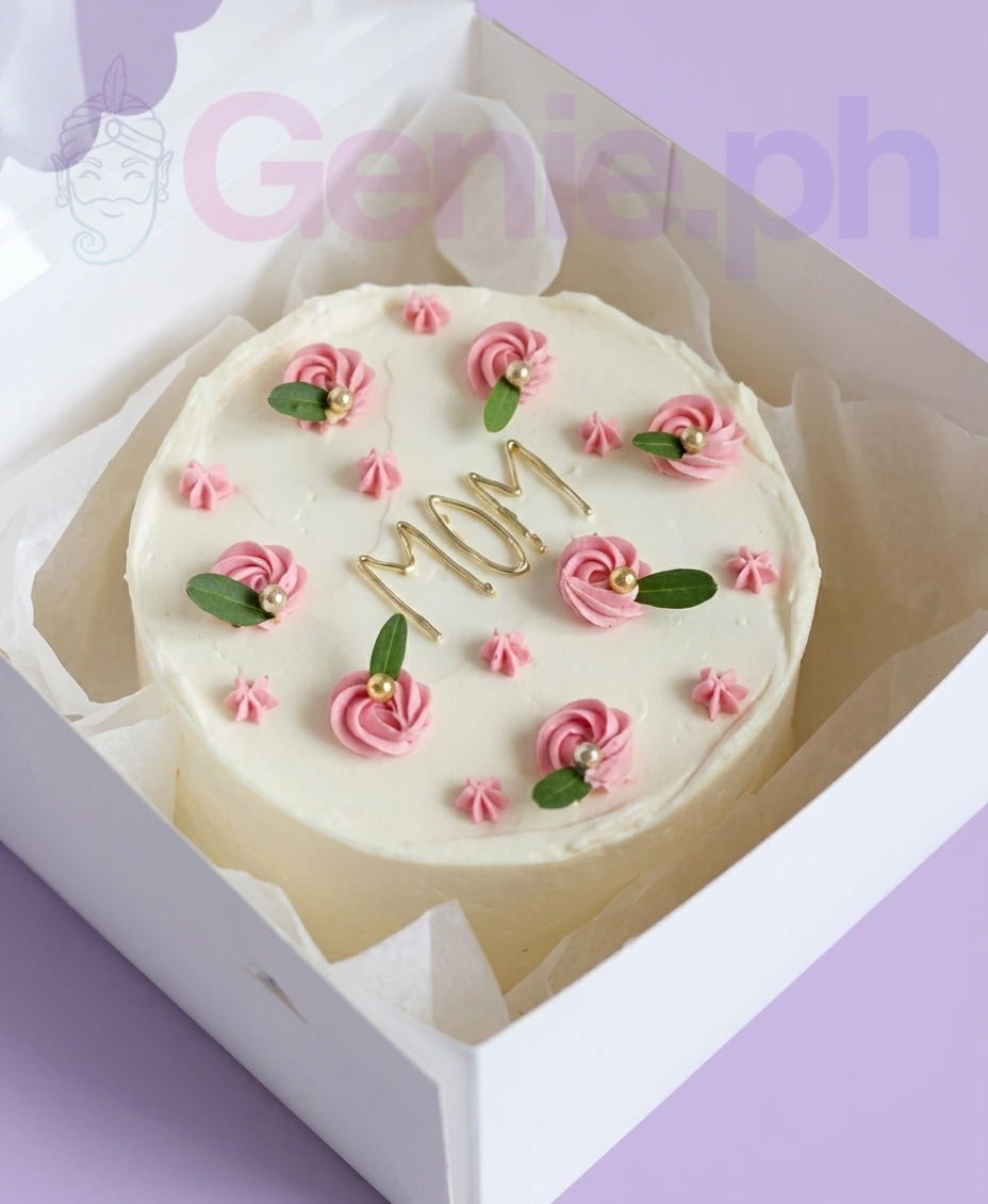 White bento cake with pink icing rosettes, green leaves, and a gold Mom topper in a white box.