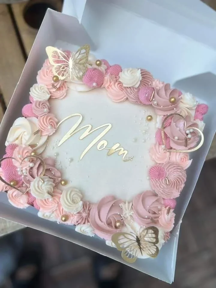 Square white cake with pink and rose gold icing rosettes, gold butterflies, and a gold Mom topper.
