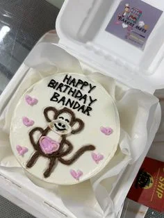 White bento cake with a hand-drawn brown monkey holding a pink heart and 'Happy Birthday Bandar' message in black icing.
