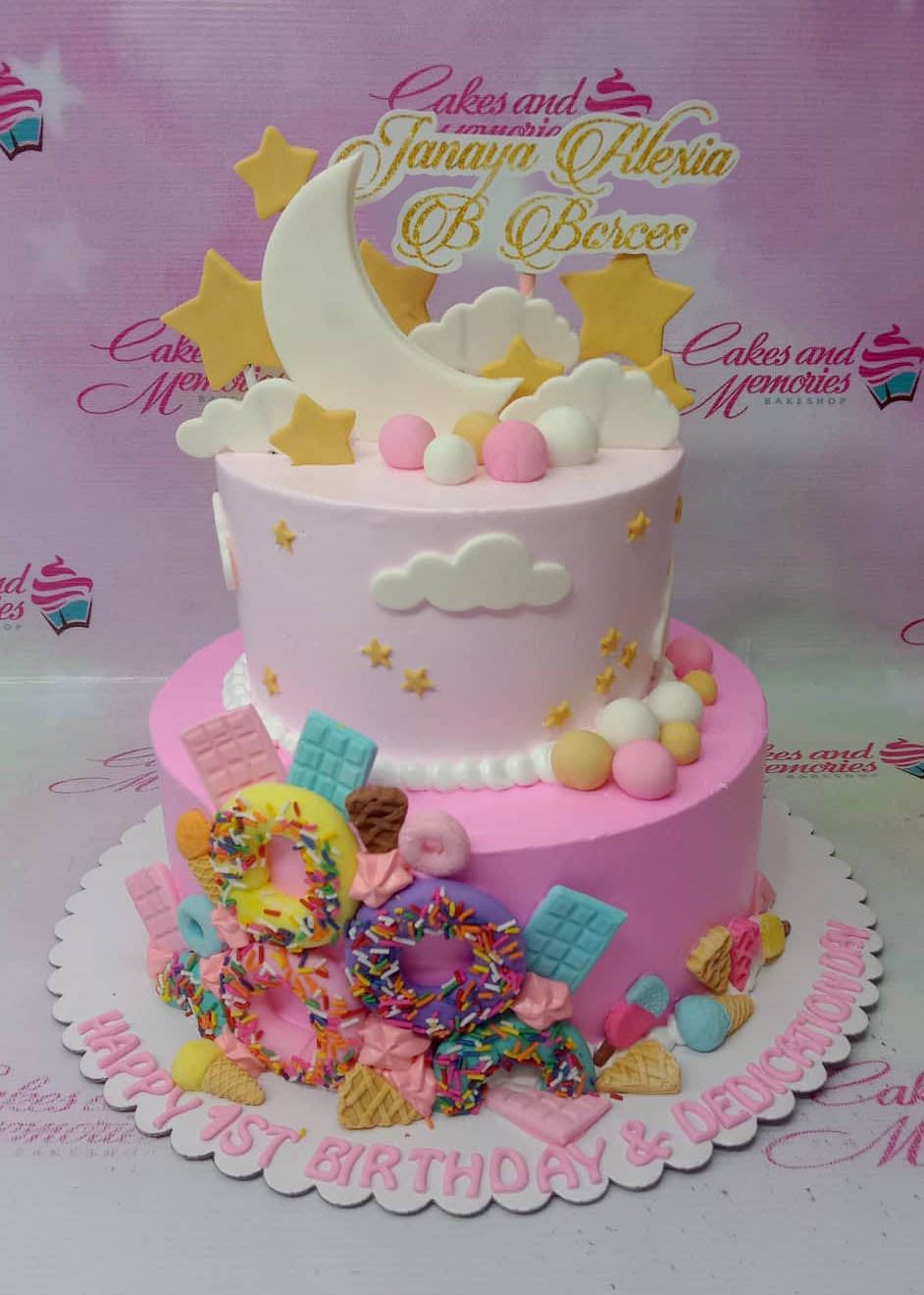 Two-tier pink birthday cake decorated with a white moon, yellow stars, clouds, and colorful fondant donuts and chocolates.