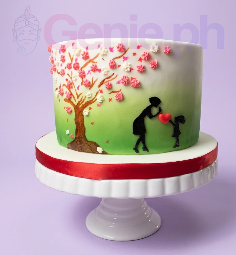 A tall white and green gradient fondant cake featuring a hand-painted tree with pink icing blossoms and a silhouette of a mother and child.