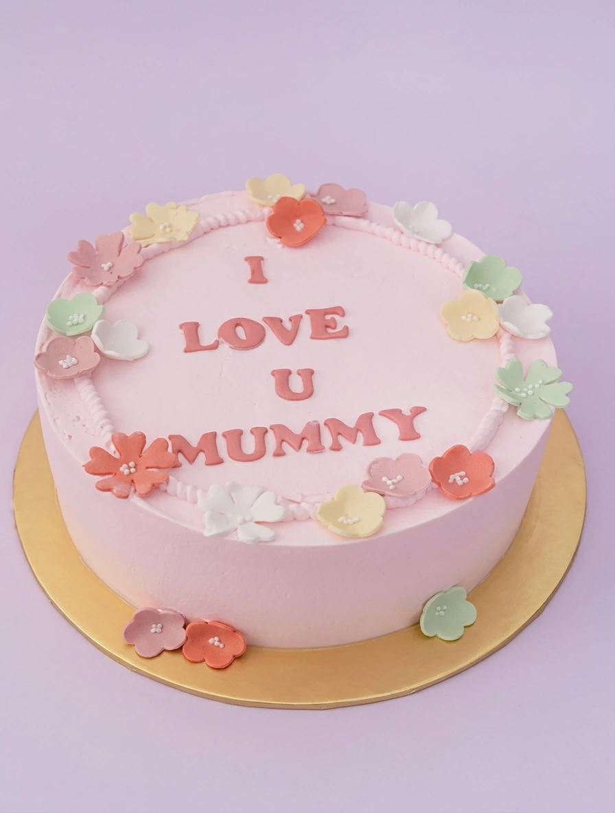 Pink minimalist cake with colorful gumpaste flowers and 'I LOVE U MUMMY' message