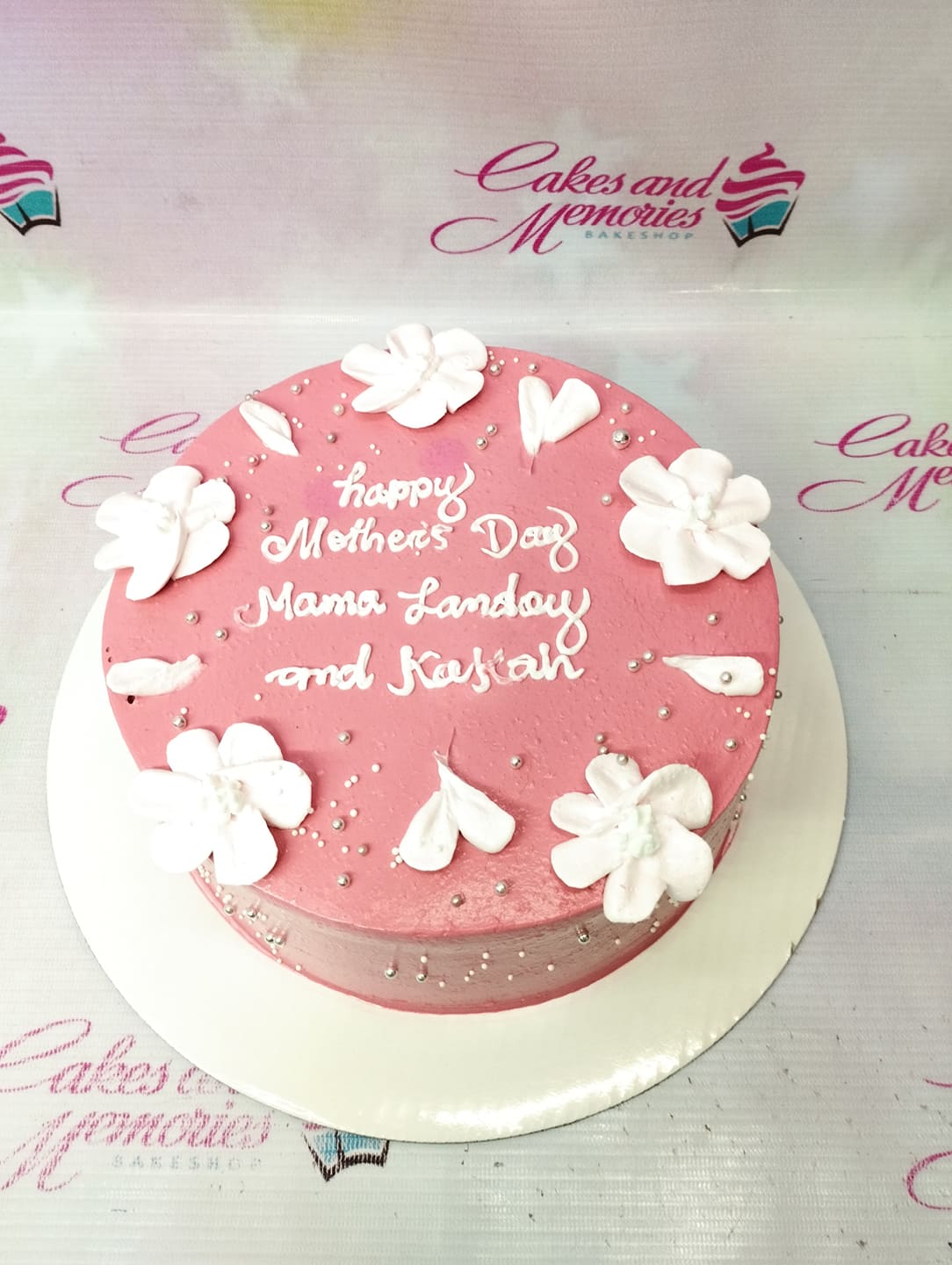 Pink minimalist Mother's Day cake with white icing flowers and silver dragees