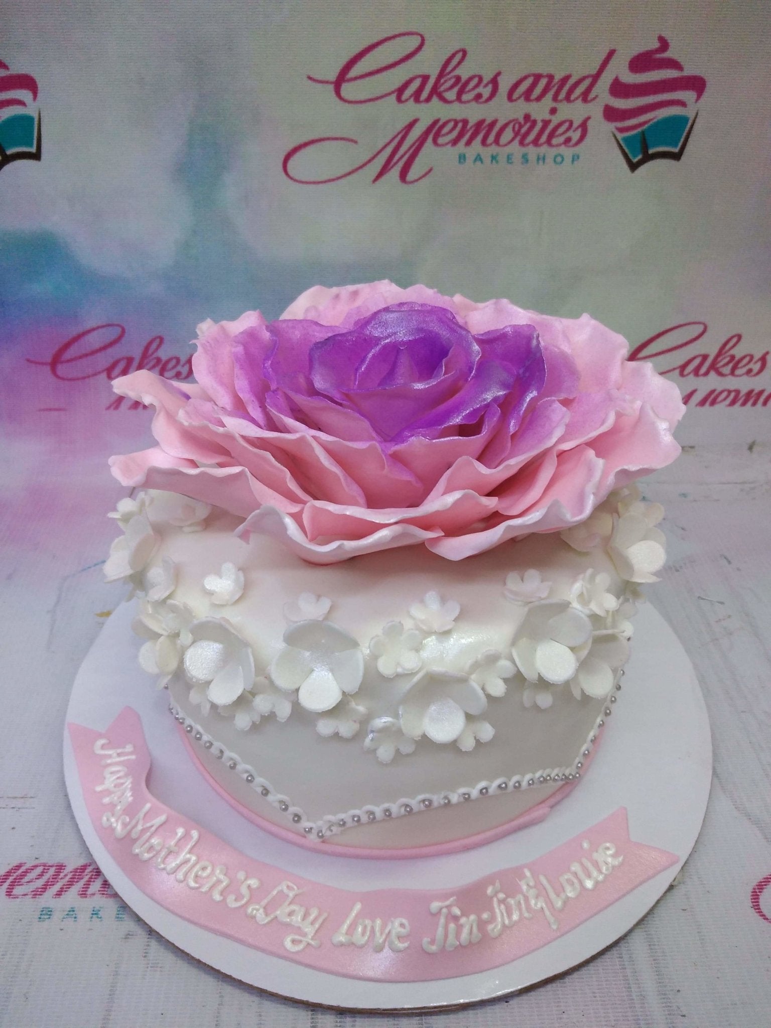 White fondant cake with a large pink and purple gumpaste rose on top and small white flowers on the side.