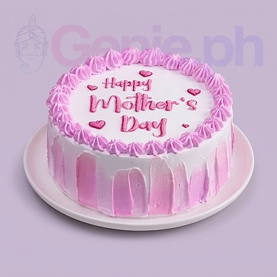 Round white cake with pink piped icing borders and a pink Happy Mother's Day message on top.