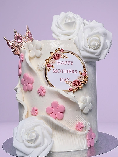 Tall white fondant cake for Mother's Day featuring a pink rhinestone crown, white sugar roses, and pink gumpaste flowers with a central message.