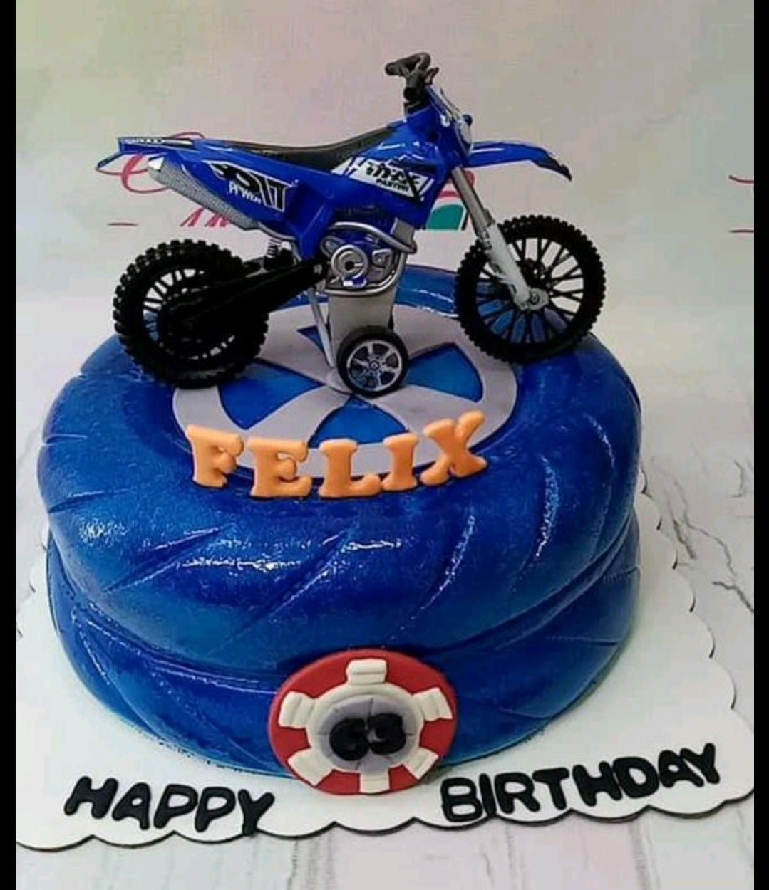 Blue tire-shaped fondant cake with a blue toy motocross bike topper and orange gumpaste name letters.