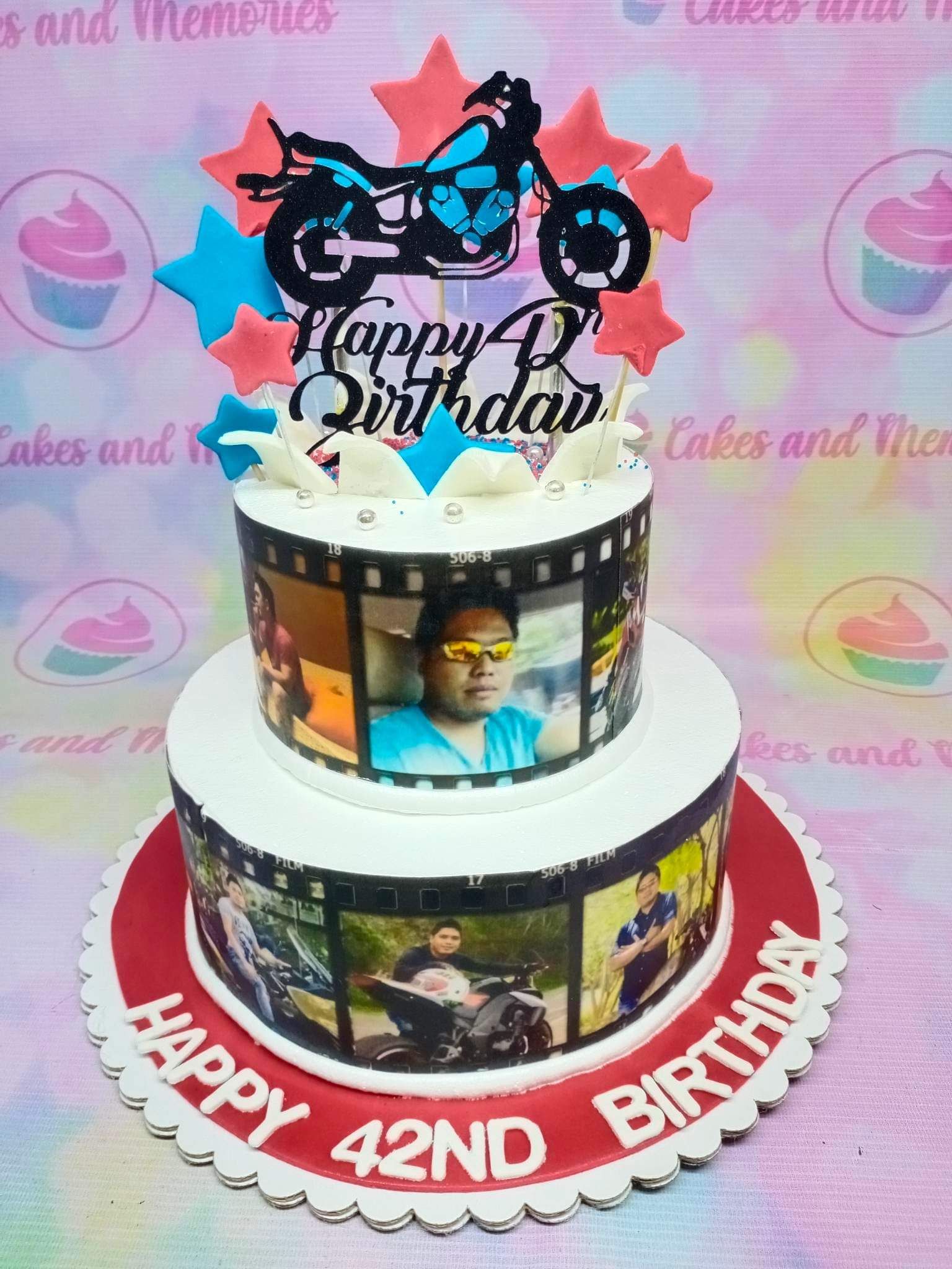 Two-tier white birthday cake featuring film strip photo prints of a man and a motorcycle, topped with a motorcycle cutout and stars.