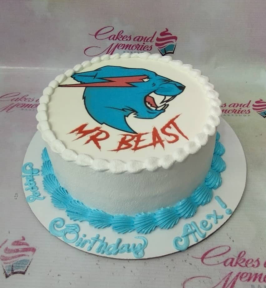 White round Mr Beast themed cake with blue and red logo and light blue icing borders on a white board.