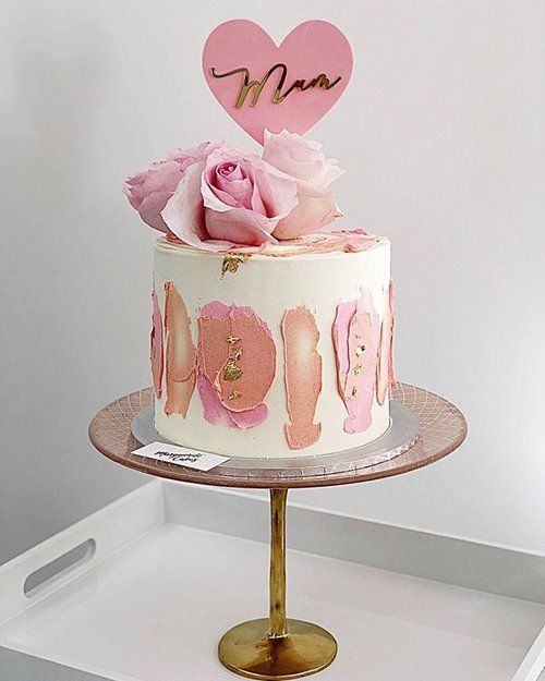 White 1-tier cake with pink and peach palette knife icing strokes, gold leaf accents, fresh pink roses, and a pink heart topper for Mum.