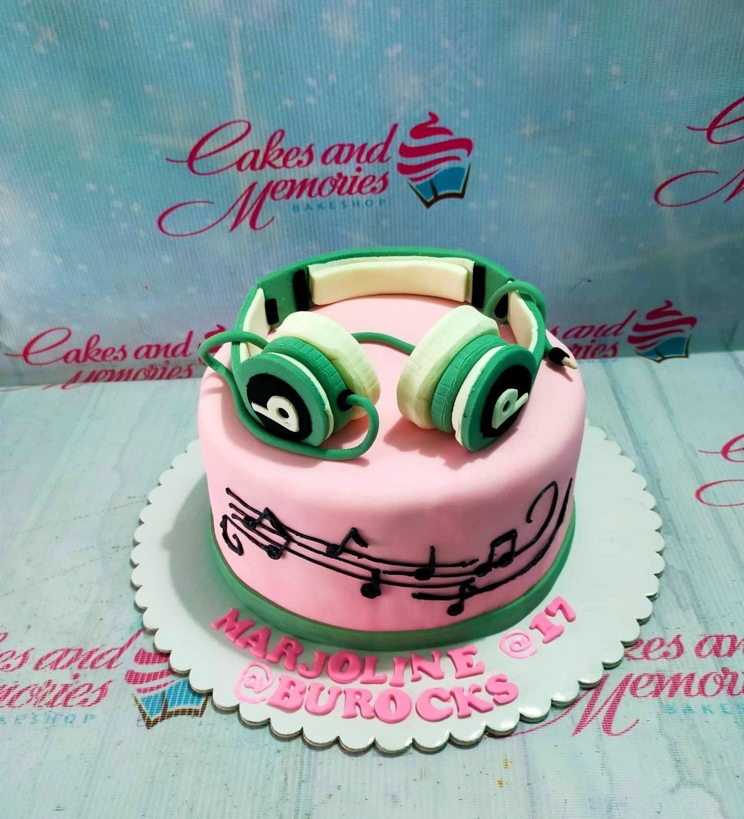Pink fondant cake with green headphones topper and black musical notes on the side.