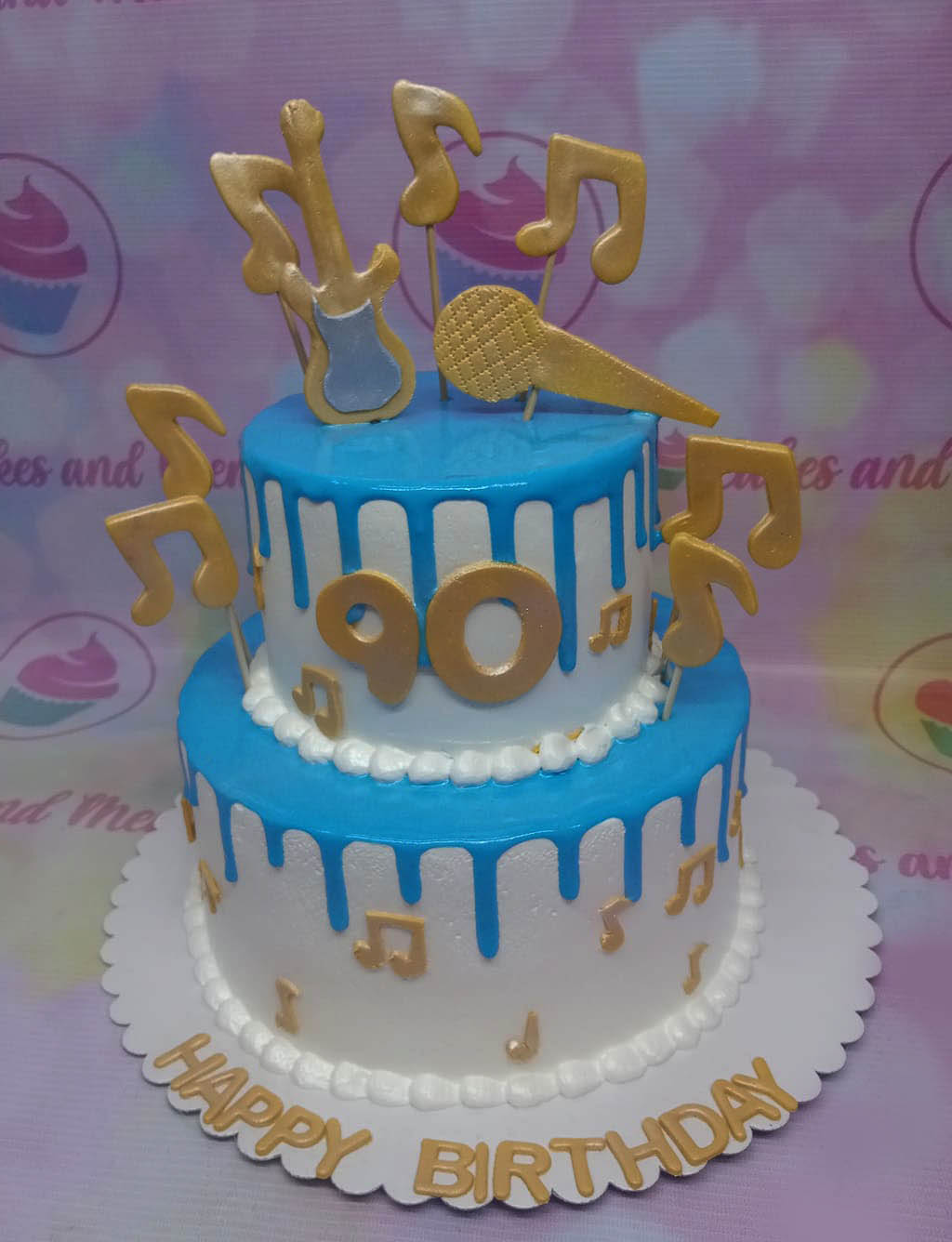 Two-tier white cake with blue icing drips, gold musical notes, a guitar, and a microphone topper for a 90th birthday celebration.