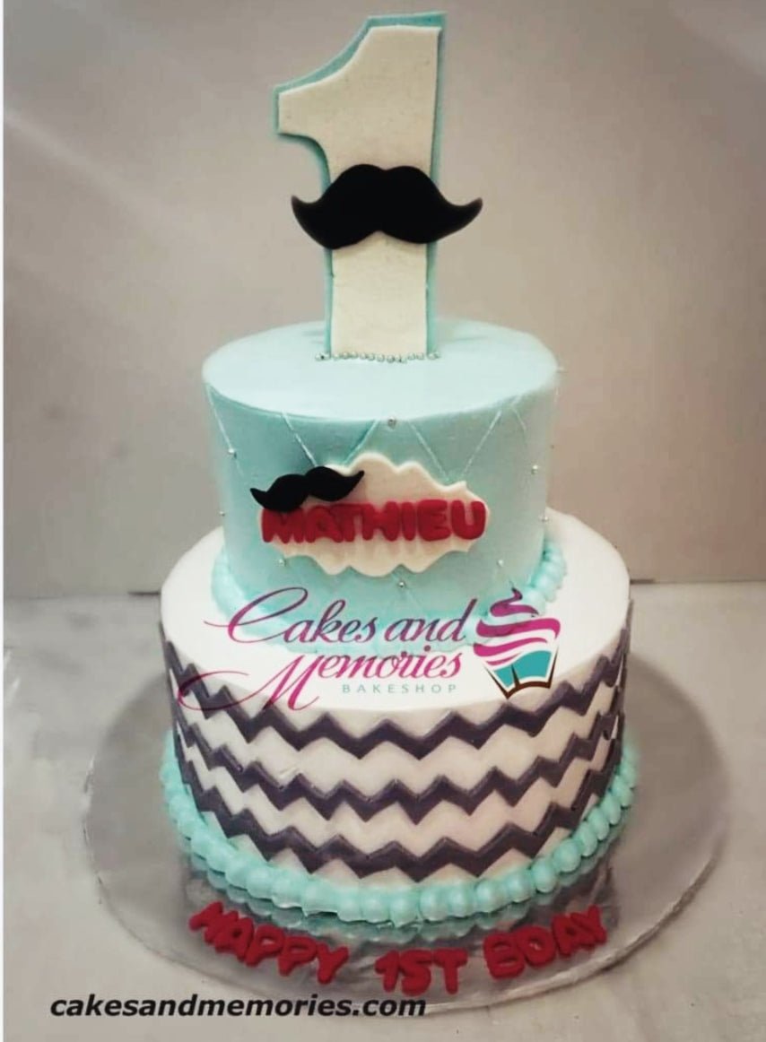 Two-tier light blue and white fondant cake with mustache toppers, a large number one, and chevron patterns for a first birthday.