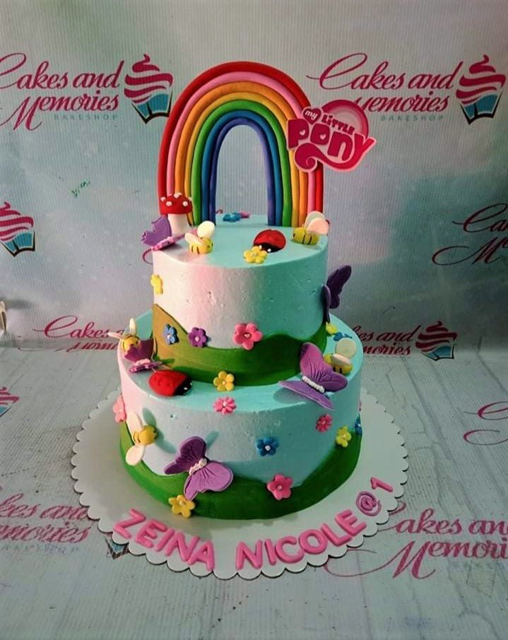 Two-tier light blue My Little Pony themed cake with a large fondant rainbow, butterflies, bees, and ladybugs.