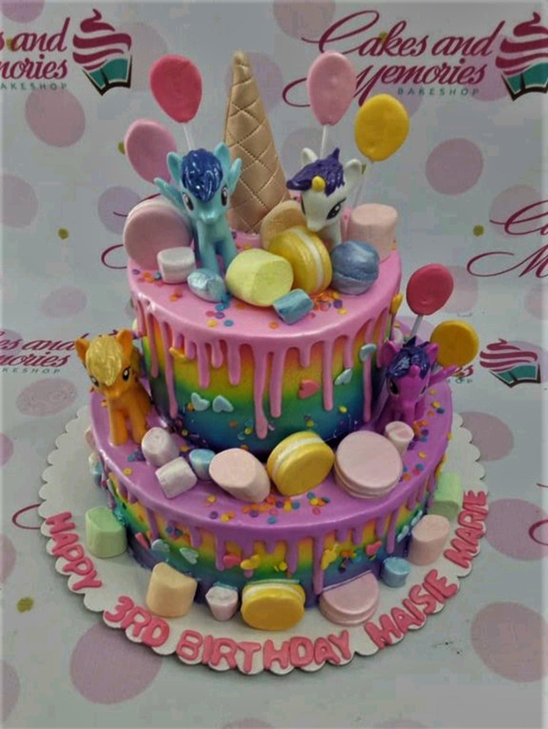 Two-tier rainbow drip cake with My Little Pony figurines, macarons, marshmallows, and lollipops for a 3rd birthday.