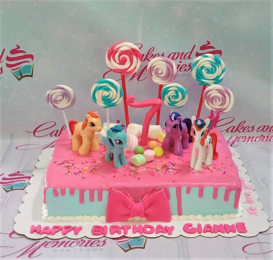 Rectangle My Little Pony birthday cake with pink and light blue icing, fondant ponies, lollipops, and a pink number 7 topper.